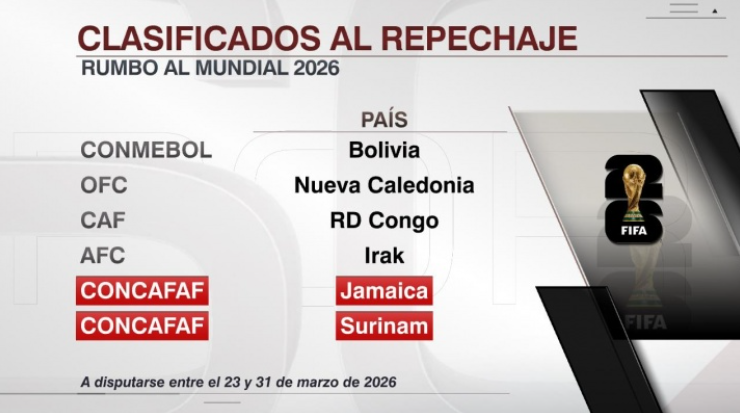 随着中北美及加勒比海地区预选赛收官,参加2026年世界杯跨洲附加赛的全部六支球队及对阵形势已正式确定。