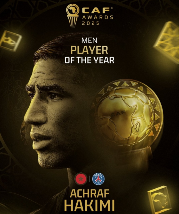 非洲足联11月19日在摩洛哥拉巴特举行了2025年颁奖典礼,巴黎圣日耳曼后卫阿什拉夫·哈基米当选非洲足球先生,击败了埃及的穆罕默德·萨拉赫和尼日利亚的维克多·奥斯梅恩。