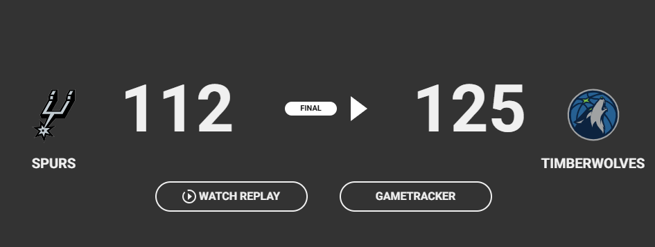 易边再战,双方陷入缠斗,马刺依靠节中一波10-2的小高潮稍占上风。然而末节风云突变,此前一直掌控局面的马刺在近8分钟内仅得7分,进攻突然断电。森林狼抓住机会,轰出一波25-7的进攻狂潮,一举扭转战局并建立起两位数领先,彻底杀死比赛悬念。最终,森林狼守住主场,成功击退来势汹汹的马刺。