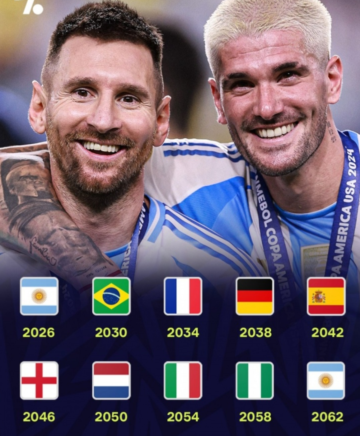 12月5日讯 Onefootball列出了AI预测的未来10届世界杯冠军,明年阿根廷卫冕,2030年巴西夺冠,2046年英格兰夺冠。