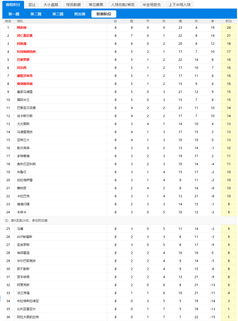1月29日讯 欧冠联赛阶段第8轮战罢,联赛阶段收官。阿森纳、拜仁、利物浦等8队直通16强,皇马、卫冕冠军巴黎、本菲卡等16队将参加附加赛。